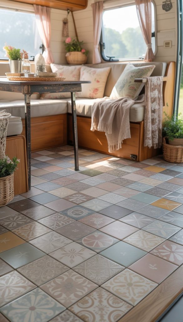 These tiles come in many colors and styles, so you can find one that fits your shabby chick look. They are durable and water-resistant, which is great for a camper that sees a lot of outdoor fun.