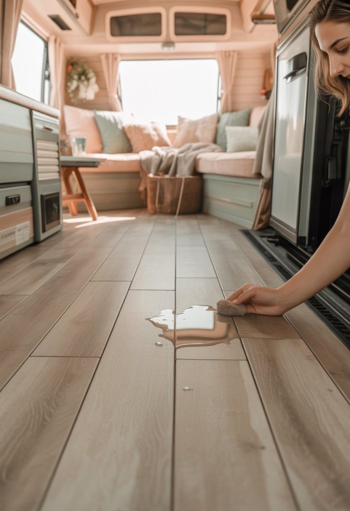 Make sure to seal your cork flooring. This helps protect it from water damage and stains. A good seal will keep your floor looking nice for longer, especially in a camper where spills can happen.