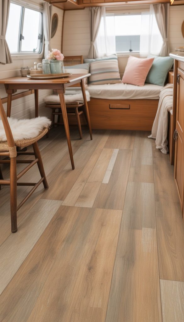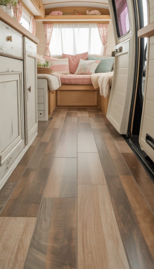 StainMaster Laminate is a strong and affordable option for your shabby chick camper. It looks like wood but costs less and is easier to clean. This type of flooring stands up well to scratches and spills, which is perfect for small spaces.