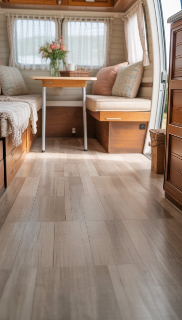 This type of flooring is made to last and can handle the bumps of travel. It is also waterproof, which helps if you get wet shoes or spills inside your camper.