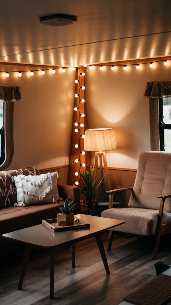 Creating a cozy vibe in your RV living room is a breeze with warm lighting. String lights and soft lamp shades can make the space feel inviting and perfect for family gatherings. A few candles can add a touch of charm, making every moment feel special.