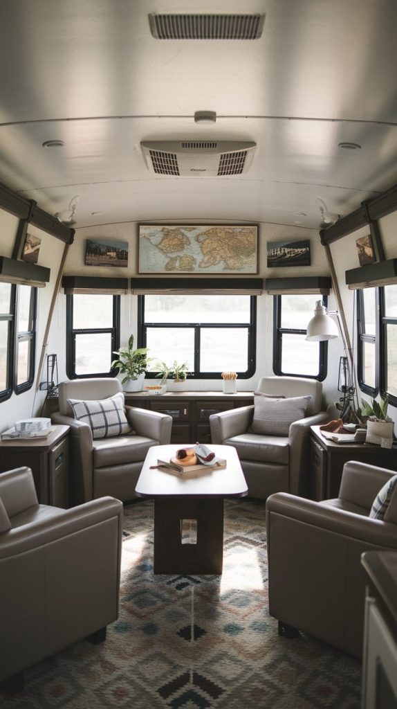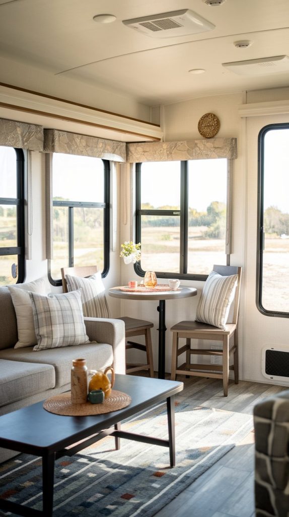 Creating a cozy seating area in your RV can make family gatherings feel warm and inviting. Plush sofas and a comfy rug offer a perfect spot for everyone to relax and chat. Add a small table for snacks or games, and you’ll have a space where memories are made!