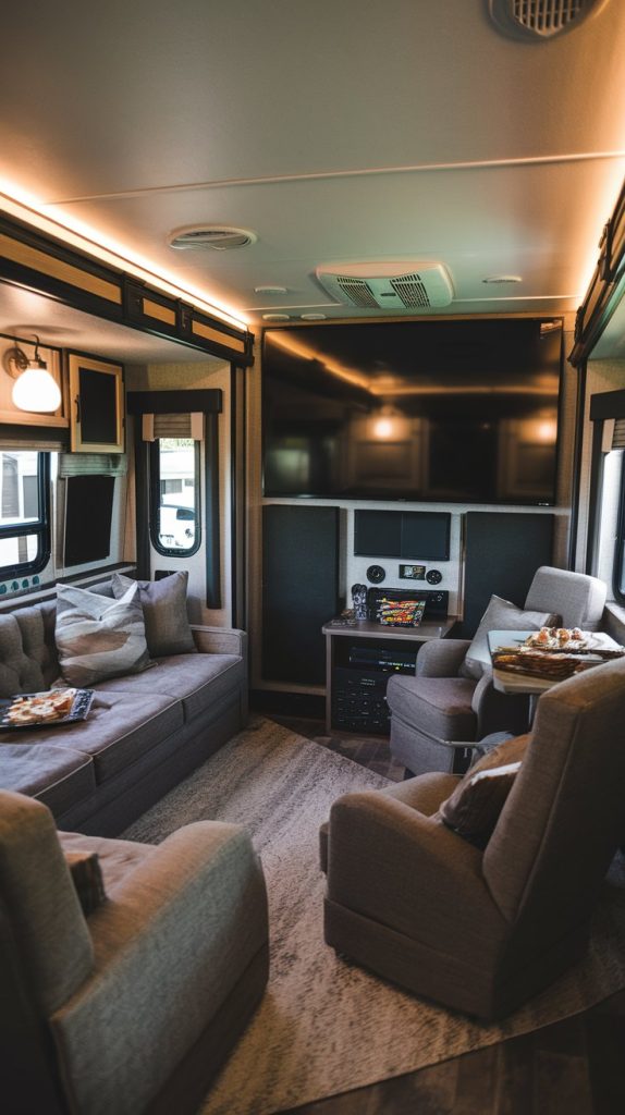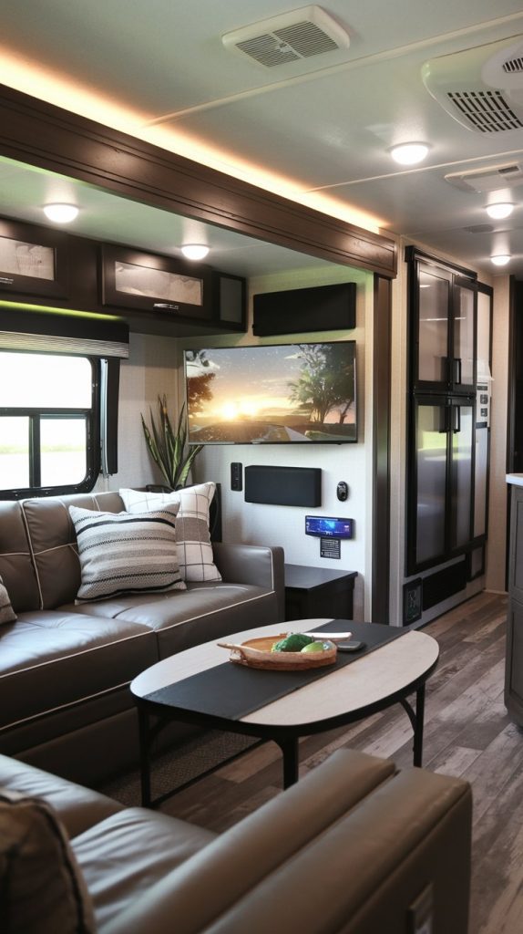 Today’s RV living rooms are all about comfort and convenience. Smart tech like voice-controlled systems and integrated sound can make family time even better. With these features, you can enjoy movie nights or just jam out to your favorite tunes, creating lasting memories on the road.