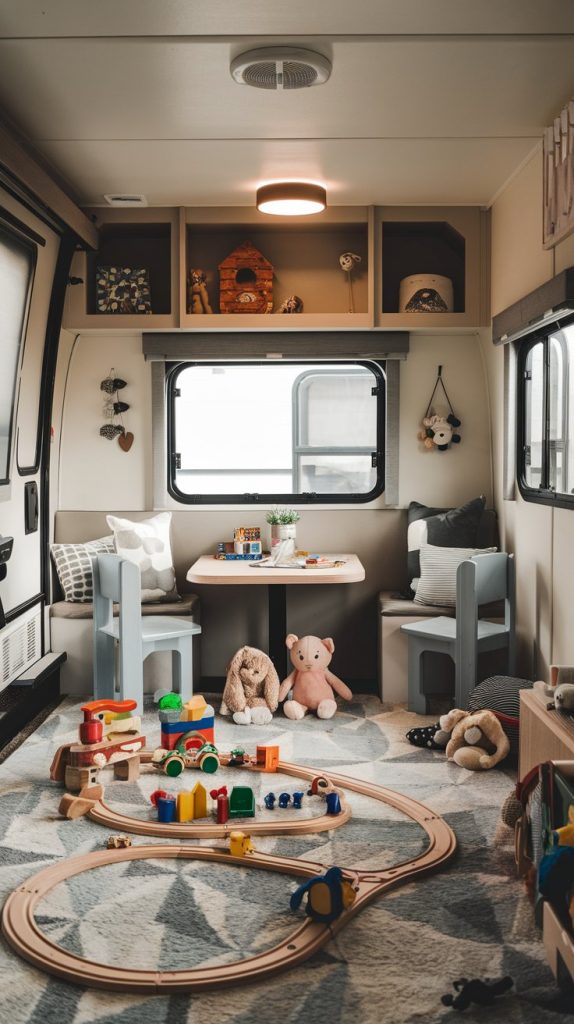 Creating a kid-friendly space in your RV can make family gatherings even more enjoyable. A soft rug and plenty of toys invite little ones to play safely while parents relax nearby. This setup not only keeps children entertained but also helps everyone feel at home on the road.