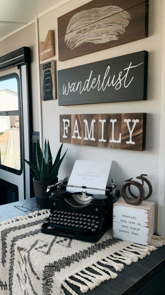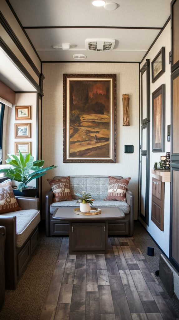 Functional art displays can truly make your RV living room shine. Think about incorporating small sculptures or unique wall art that sparks conversation. These pieces not only beautify your space, but also reflect your family’s personality and interests.
