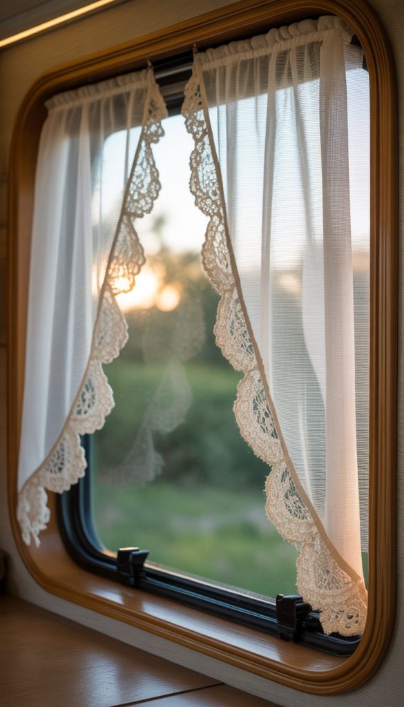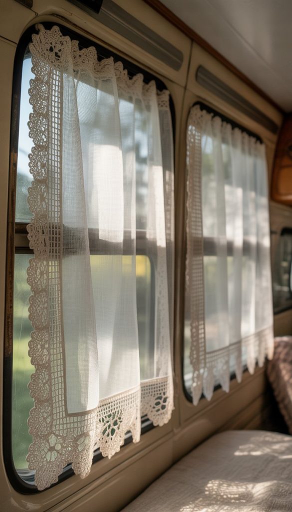 Lace curtain panels bring a soft, airy feel to your camper’s windows. They let in natural light while giving your space a gentle vintage touch. Adding vintage doily trim makes the curtains look extra special and unique.