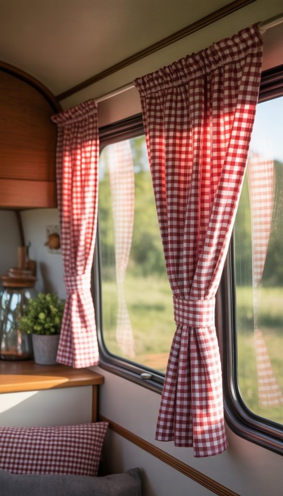 Gingham check curtains bring a cozy and classic feel to your camper’s windows. The simple check pattern is easy to match with other shabby chic decor. You can find gingham in many colors, but soft pastels or traditional red and white work best for a vintage look.