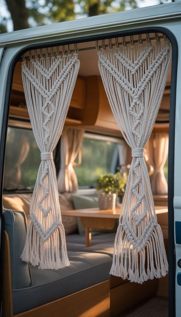 Delicate macramé curtain panels add a soft, handmade touch to your camper’s windows. They create a light and airy vibe that fits perfectly with a shabby chic style. You can find patterns that let light through while still giving you some privacy.