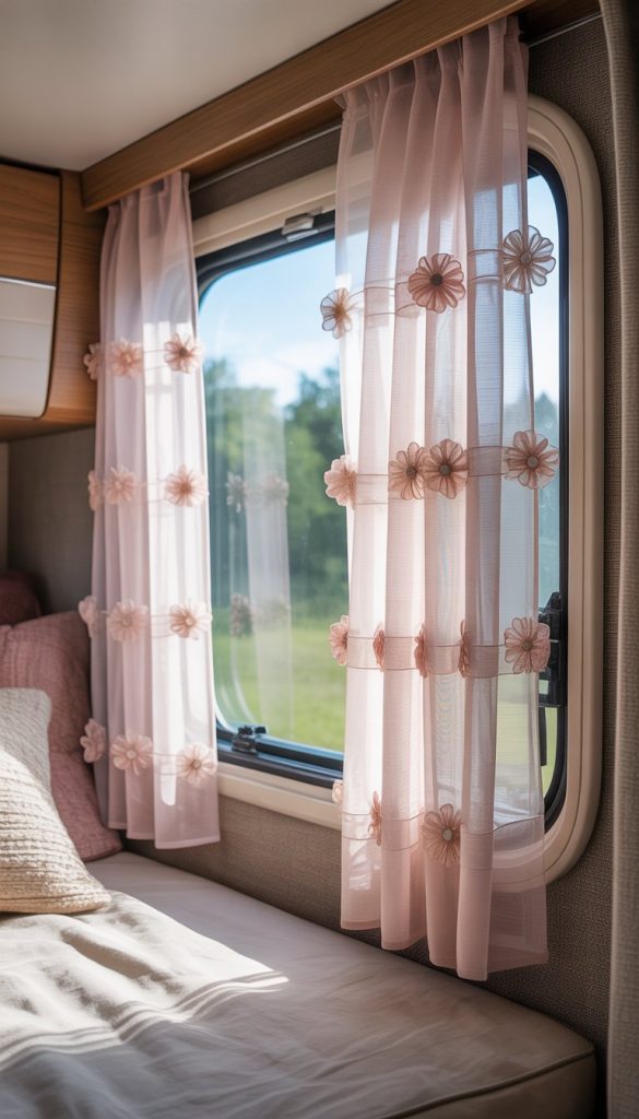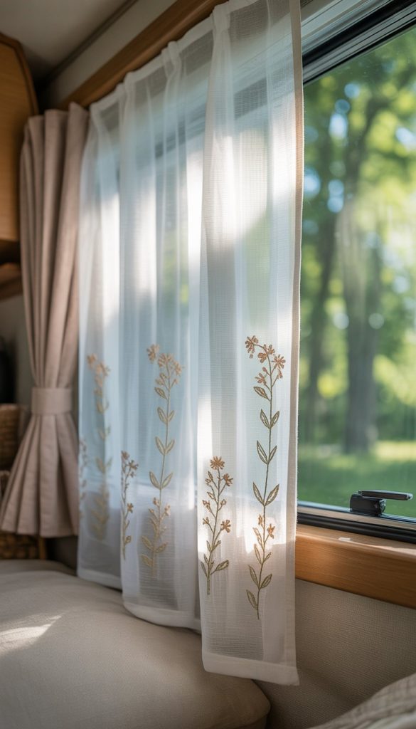 Choose sheer curtains with subtle, pastel-colored embroidery. This will keep the look fresh and light. You can also layer them with simple white curtains to add privacy when you need it. This combo keeps your camper bright but cozy at the same time.