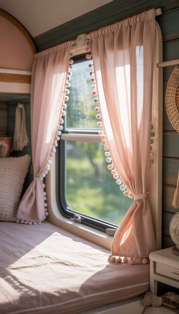 Tiny pom-pom trim curtains add a fun and cozy touch to your camper windows. The small pom-poms hang along the edge, giving your curtains texture and a playful look. You can choose pom-poms in soft pastels or bright colors to match your camper’s shabby chic style.