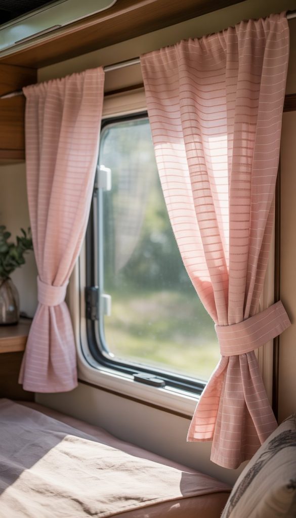 Soft pink striped curtains bring a gentle, calm feel to your camper’s windows. The subtle stripes add just enough pattern without being too bold. This helps your windows look fresh and bright while keeping the shabby chic vibe.