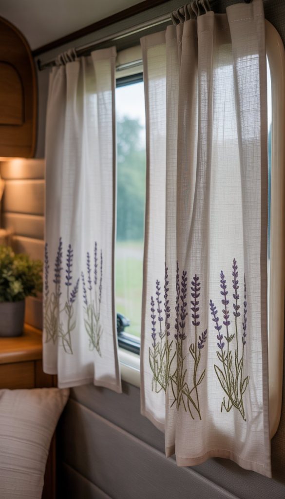 Embroidered linen curtains add a soft, natural look to your camper’s windows. The light fabric lets in sunlight while keeping your space cozy. Lavender sprigs stitched along the edges bring a touch of charm and a calming feel.