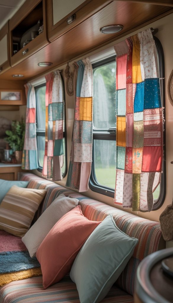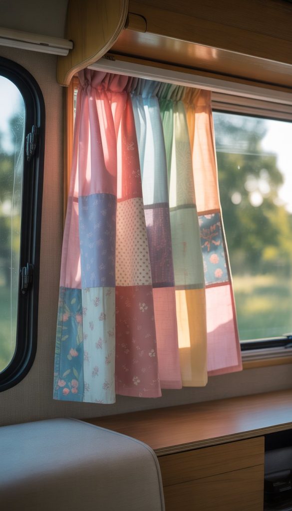 Patchwork fabric curtains add a cozy, handmade feel to your camper’s windows. Using soft pastel colors like light pink, mint green, and baby blue creates a gentle, shabby chic look. You can mix different fabric patterns like florals, stripes, and checks to keep things interesting.