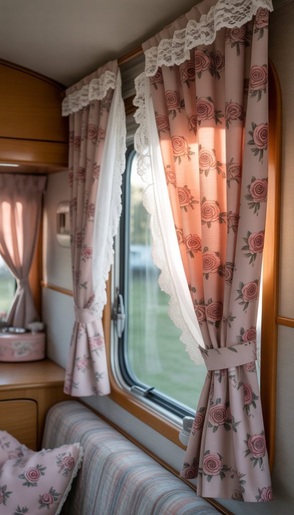 Choose lace trims with small, intricate patterns. They add detail without overwhelming the rose print. You can sew the lace yourself or buy curtains that already have the trim attached. This is an easy way to brighten up your camper’s windows.