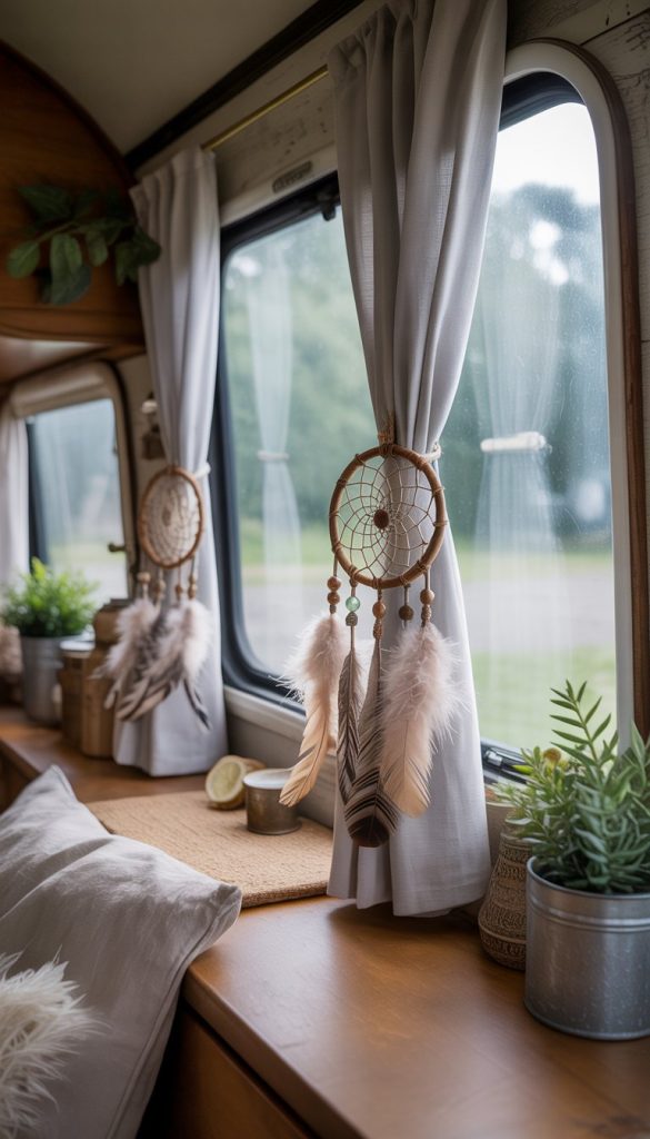 Using dreamcatchers as curtain tiebacks adds a relaxed, boho feel to your camper’s windows. These little decorations catch the light and bring some charm to your shabby chic style.