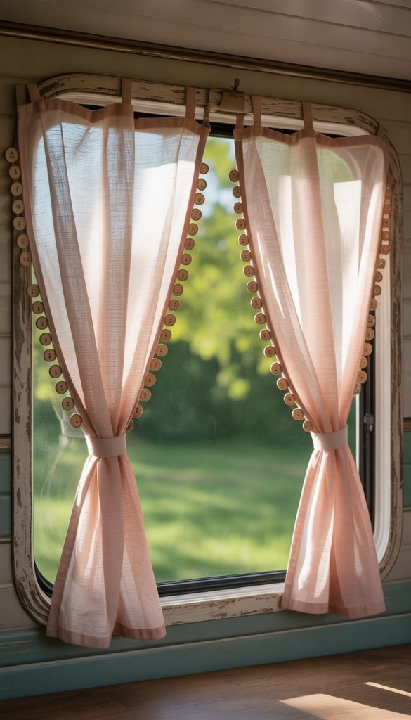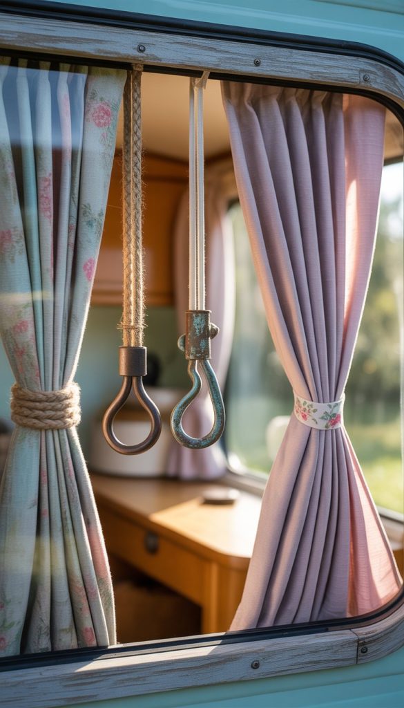 Mix a vintage button, a piece of ribbon, and a small wooden hook. This combo makes your curtains look personalized and charming. It also gives your camper a warm, lived-in vibe.