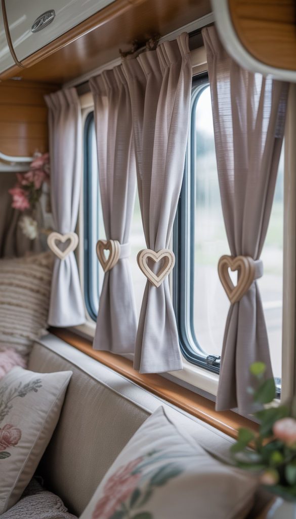 Heart-shaped tiebacks add a sweet and charming touch to your camper’s curtains. They help keep your curtains open while adding a bit of personality to your windows.
