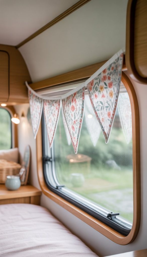 A hand-stitched floral bunting valance adds a soft, personal touch to your camper’s windows. You can use fabric scraps with pretty flower prints to create small triangles. Sew them together by hand for a charming, homemade feel.