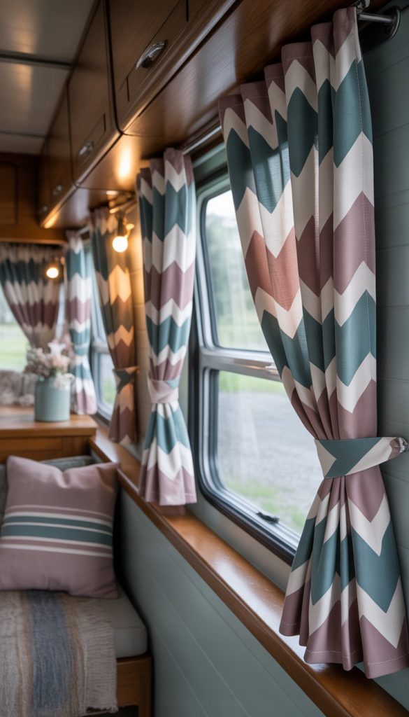 Chevron print curtains add a stylish touch to your camper’s windows. The zigzag pattern brings energy without being too loud. Using muted colors keeps the look soft and relaxed.