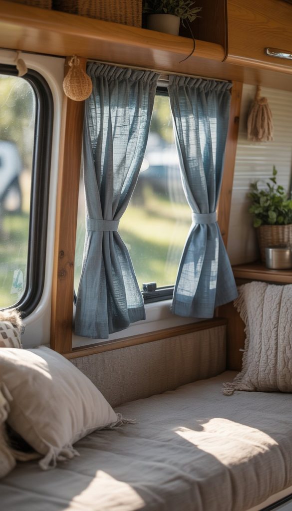 Choose chambray curtains with a slight fade or worn edges. This adds character and matches the vintage feel you want in your camper. Pair them with simple tiebacks to keep things neat but easy to open and close.