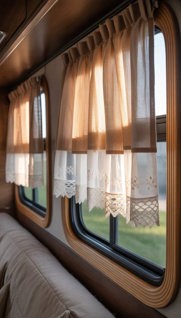 Vintage lace curtains give your camper windows a soft, delicate look. The scalloped edges add charming details without being too fancy. They let in light while still offering some privacy.