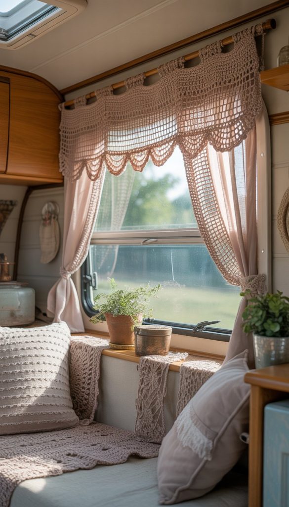 Crochet curtain valances add a soft, vintage touch to your camper’s windows. They let light in while still giving you some privacy. You can find them in many patterns and colors to match your camper’s shabby chic style.