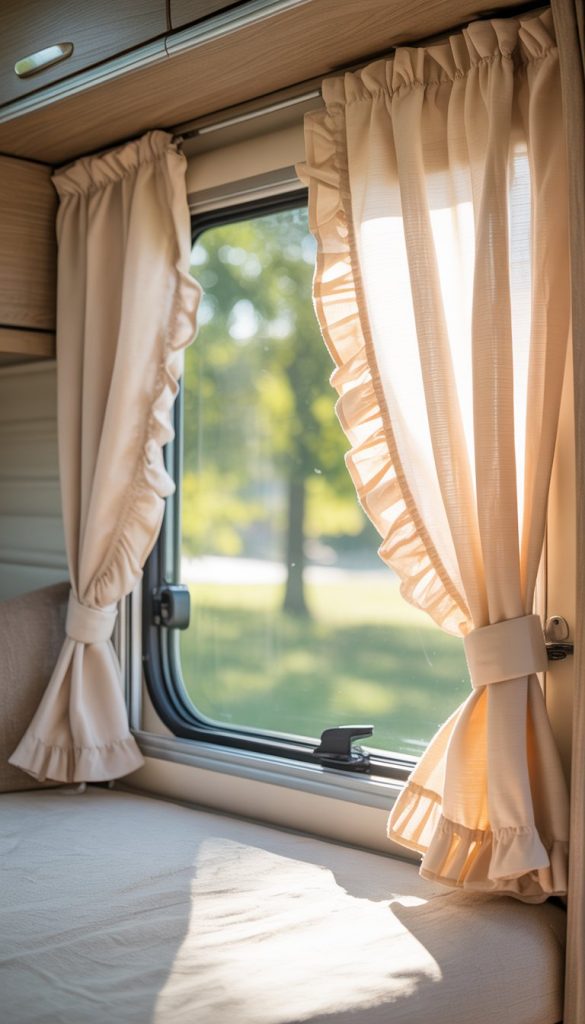 Use lightweight cotton or linen fabric. It will flow nicely and be easy to wash. You can also add tie-back ribbons to keep the curtains neat and tidy when you want full sunlight. This simple touch makes your camper feel cozy.
