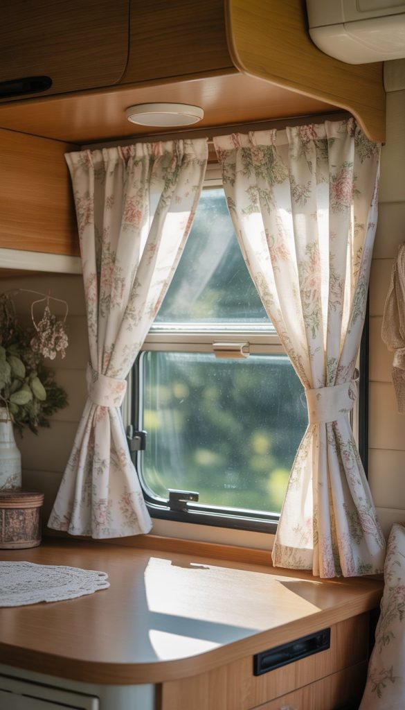 Adding curtains with a repeating rose pattern gives your camper’s windows a soft, vintage look. The floral design feels fresh but still cozy.