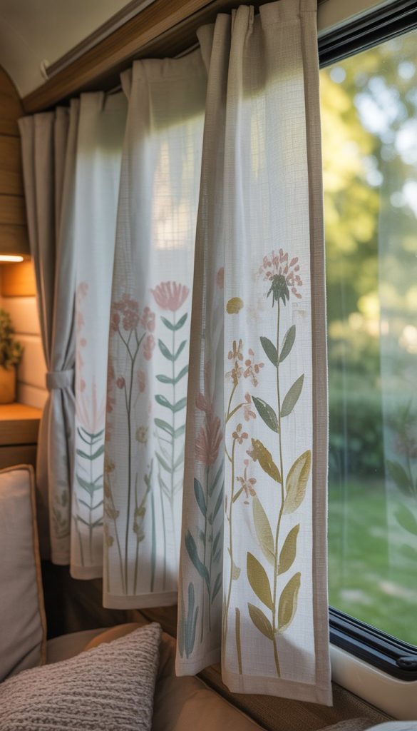 Hand-painted linen curtains add a personal touch to your camper’s windows. You can choose simple garden designs like flowers, leaves, or vines that match your shabby chic style.