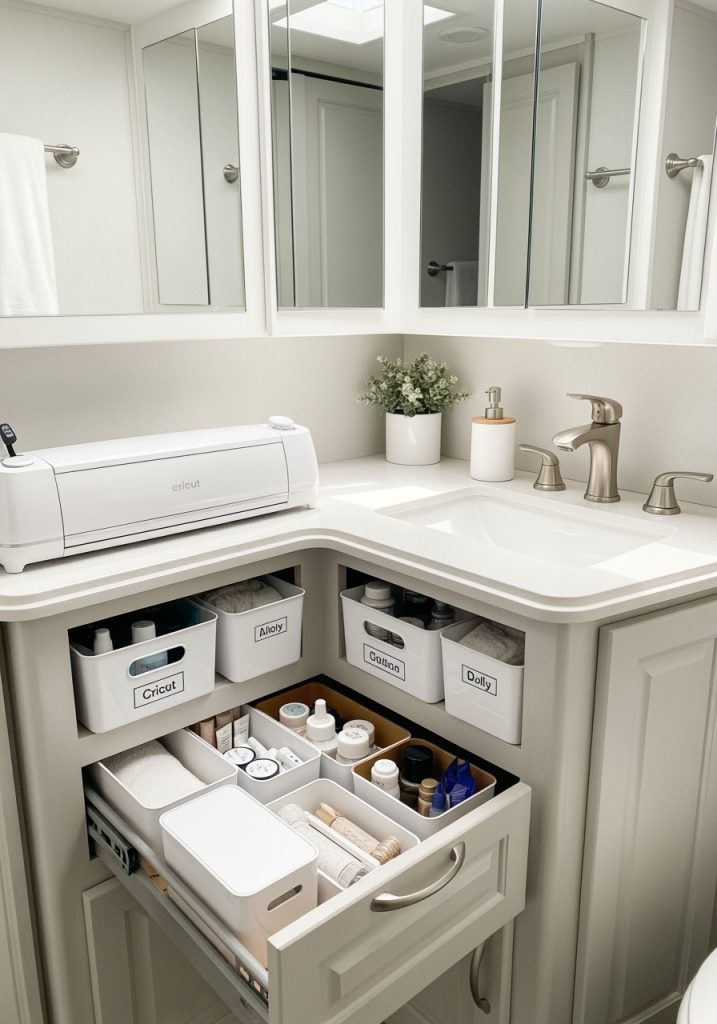 Create comprehensive bathroom organization using labeled storage containers, mirror decals, and functional decorative elements. RV bathrooms require maximum efficiency in minimal space, making smart organization essential. Custom solutions ensure every item has a designated place while maintaining aesthetic appeal.