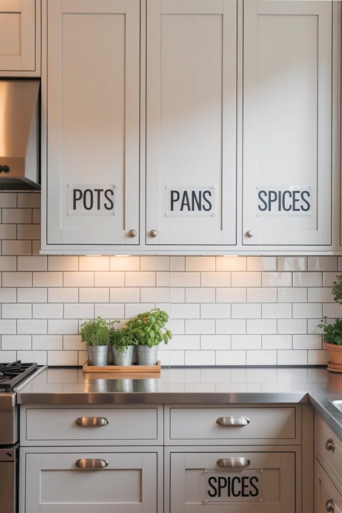 PRO TIP: Use removable vinyl for cabinet labels to allow for reorganization as your storage needs change. Position labels on cabinet frames rather than doors to prevent wear from frequent opening and closing.