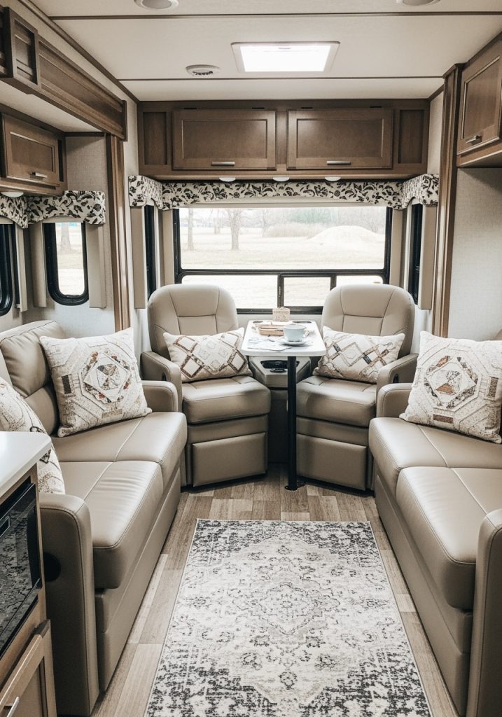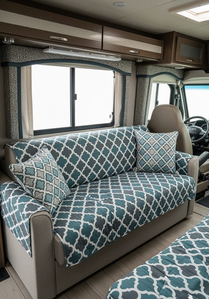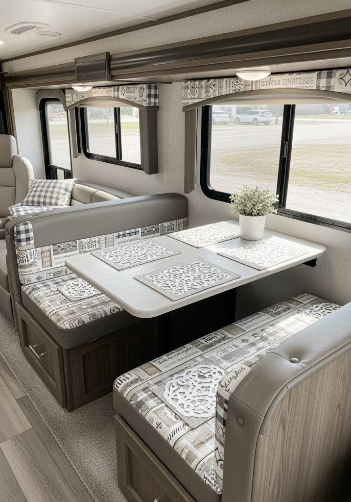 Choose durable, easy-care fabrics that can withstand frequent use and washing. The dining area sees heavy use in RVs, making fabric choice crucial for longevity. Coordinated covers create cohesive seating areas that feel intentionally designed.