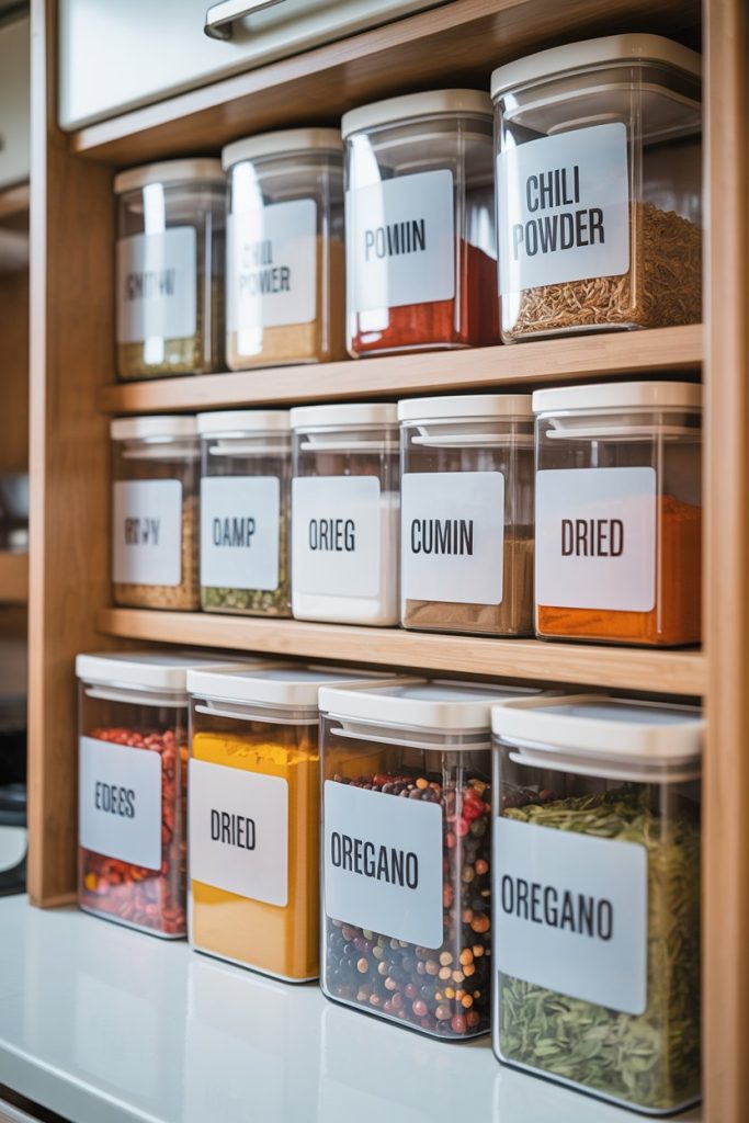 PRO TIP: Use waterproof vinyl for spice labels and include standard measurement conversions (teaspoons to tablespoons) on labels for convenient cooking reference without consulting cookbooks.