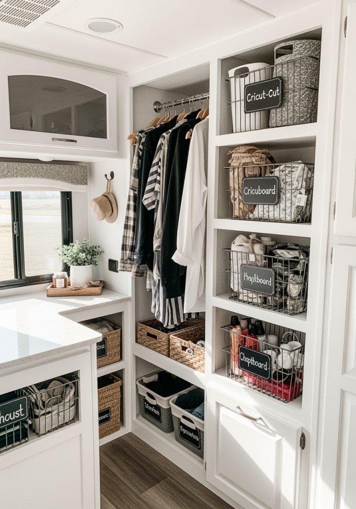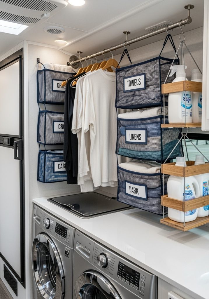 Create laundry sorting, storage, and organization systems using labeled bags, hanging organizers, and space-efficient solutions. Laundry management in RVs requires creativity and organization to maintain cleanliness without overwhelming limited space.
