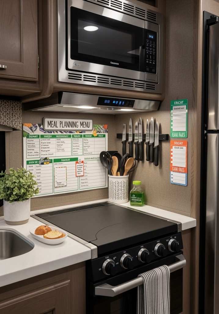 Design meal planning and grocery organization systems using dry-erase vinyl, chalkboard surfaces, and magnetic elements. Efficient meal planning becomes crucial during extended RV trips, and custom systems help manage limited storage and shopping opportunities.