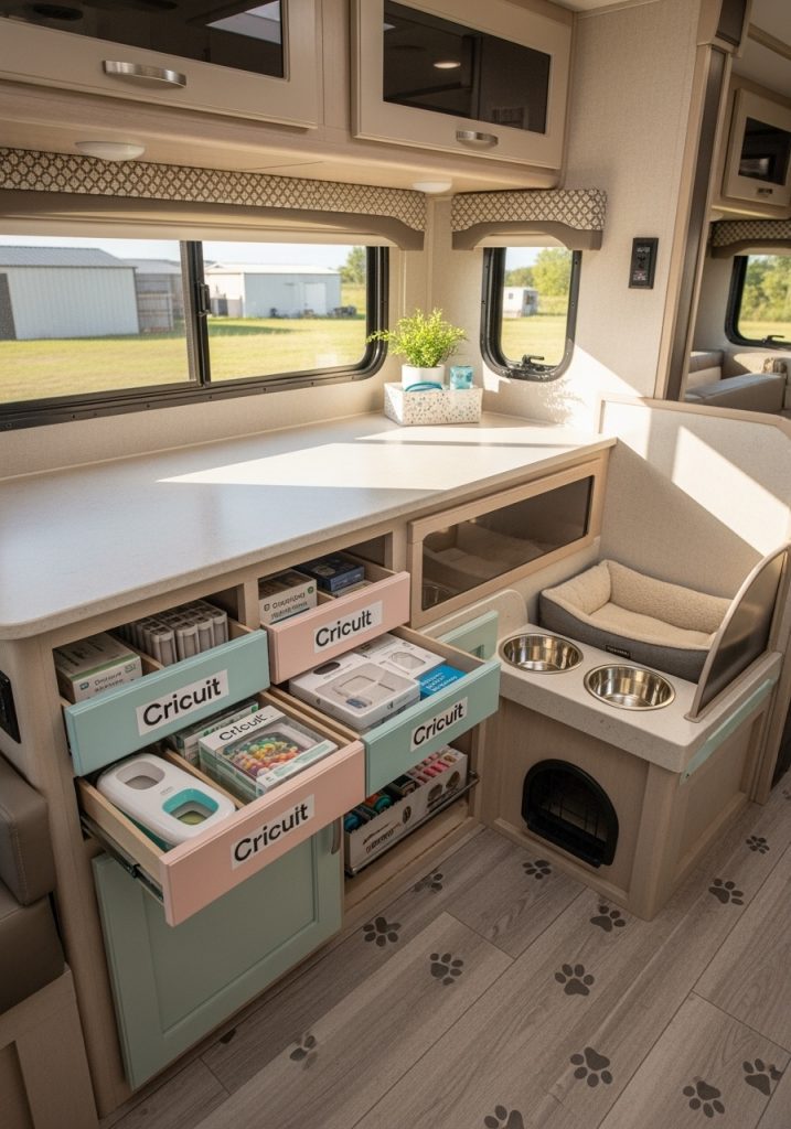 Design specific areas and organization systems for pet supplies, feeding stations, and comfort items. RV traveling with pets requires thoughtful organization to maintain cleanliness and convenience. Custom solutions address the unique needs of pet-friendly RV living.