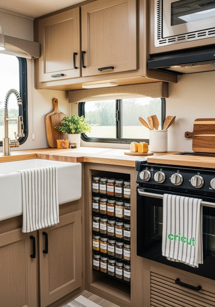 Create a uniform, organized spice collection with custom labels featuring both text and measurement conversions. Include common substitutions or conversion charts on labels to maximize functionality. A well-labeled spice collection saves space and reduces cooking prep time in your RV kitchen.