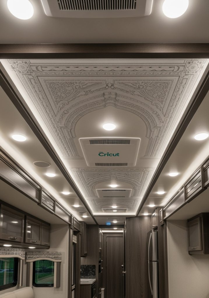 Create the illusion of architectural details on RV ceilings using lightweight vinyl designs that add visual interest without adding weight. Ceiling treatments can make small spaces feel larger and more finished. Choose designs that complement your lighting fixtures and overall space proportions.