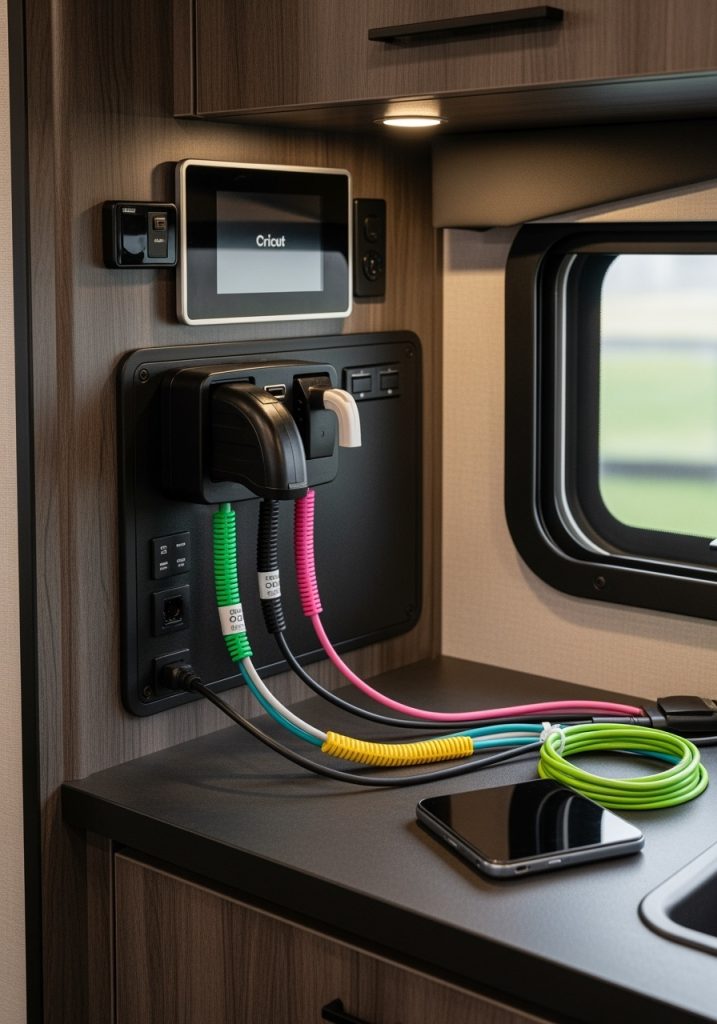 PRO TIP: Use spiral cable wrap covered with decorative vinyl for flexible cord management that accommodates different cable sizes while maintaining a cohesive appearance throughout your RV.