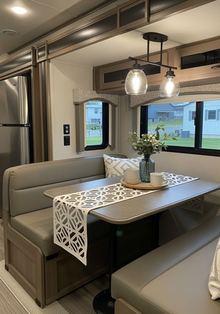 Fabric table linens add warmth and personality to meal times while protecting your surfaces. Choose fabrics that are easy to clean and maintain, considering the practical demands of RV living. Multiple sets allow for seasonal rotation or special occasion dining while maintaining a fresh, styled appearance.