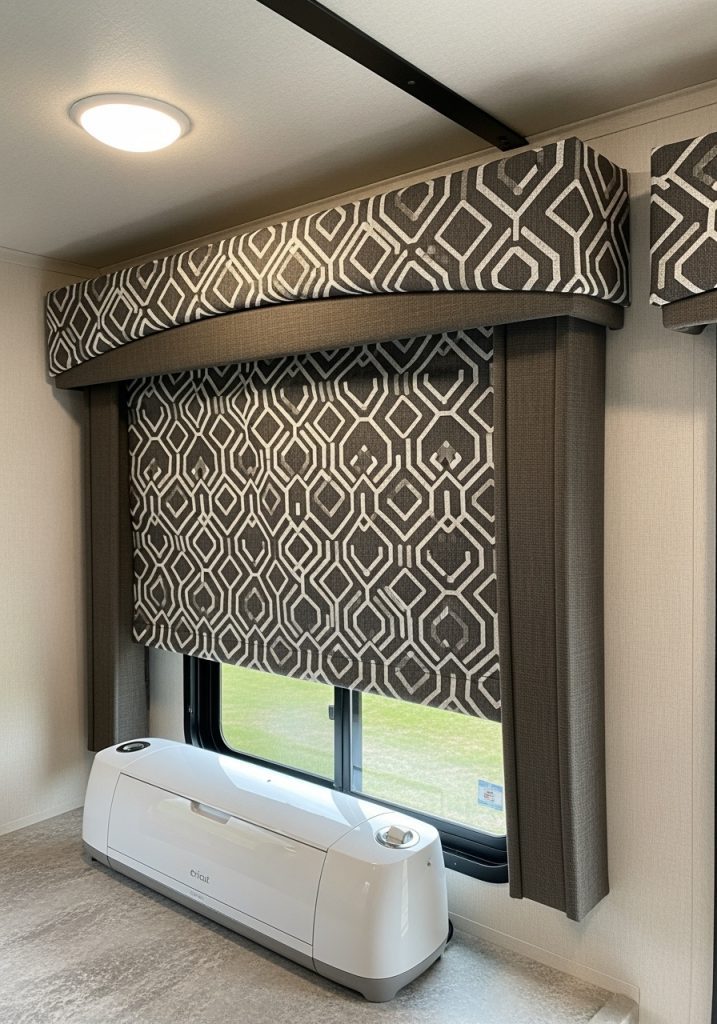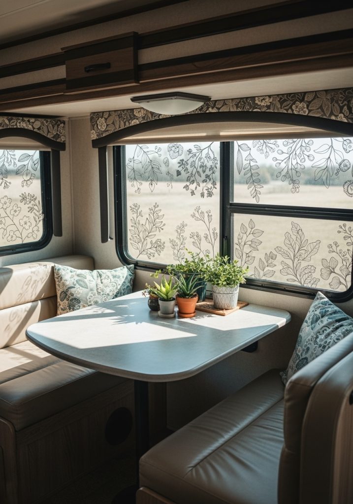 Create beautiful window treatments using frosted or decorative vinyl cut into botanical patterns, geometric designs, or abstract shapes. These custom window clings provide privacy while allowing natural light to filter through, creating beautiful shadow patterns throughout your RV. Unlike traditional curtains, vinyl window treatments don’t require hardware installation or take up valuable storage space.