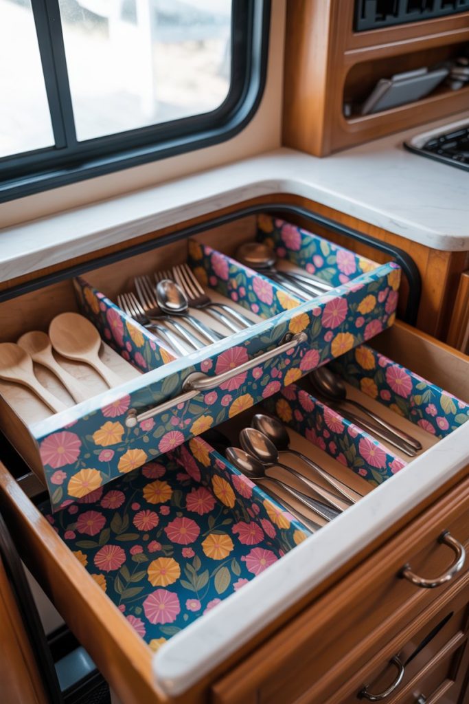 Cut custom drawer and shelf liners from decorative contact paper or fabric using your Cricut for perfect fits in oddly-shaped RV storage spaces. These liners protect surfaces while adding color and pattern to hidden areas that reveal themselves during daily use. Coordinated liners create a sense of thoughtful design throughout your RV.