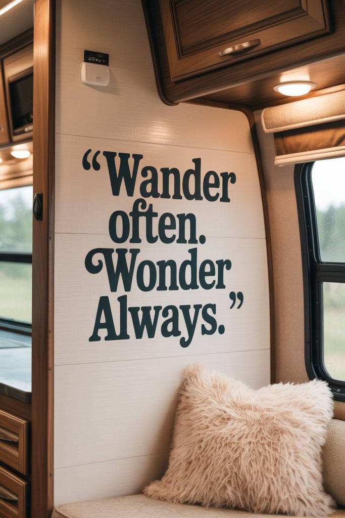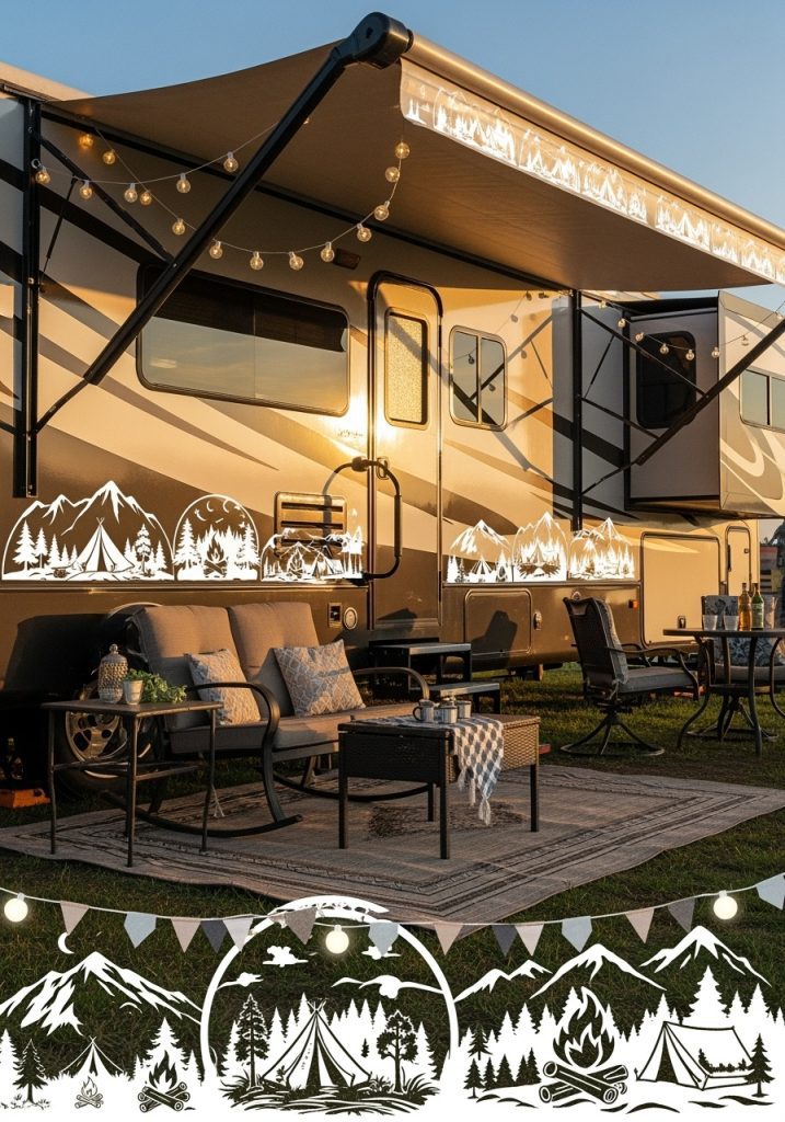 Design elements that enhance your outdoor camping experience – directional signs for hiking trails, motivational quotes about adventure, or decorative patterns that complement your camping gear. Consider creating a cohesive outdoor theme that flows from your RV interior to your external living space.