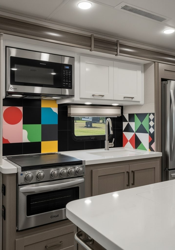 Transform your RV kitchen with removable vinyl tile patterns that create the appearance of a designer backsplash without permanent installation. Cut geometric patterns, subway tile designs, or moroccan-inspired motifs from adhesive vinyl to create sophisticated kitchen styling. This approach allows for easy updates and removal without damaging original surfaces.