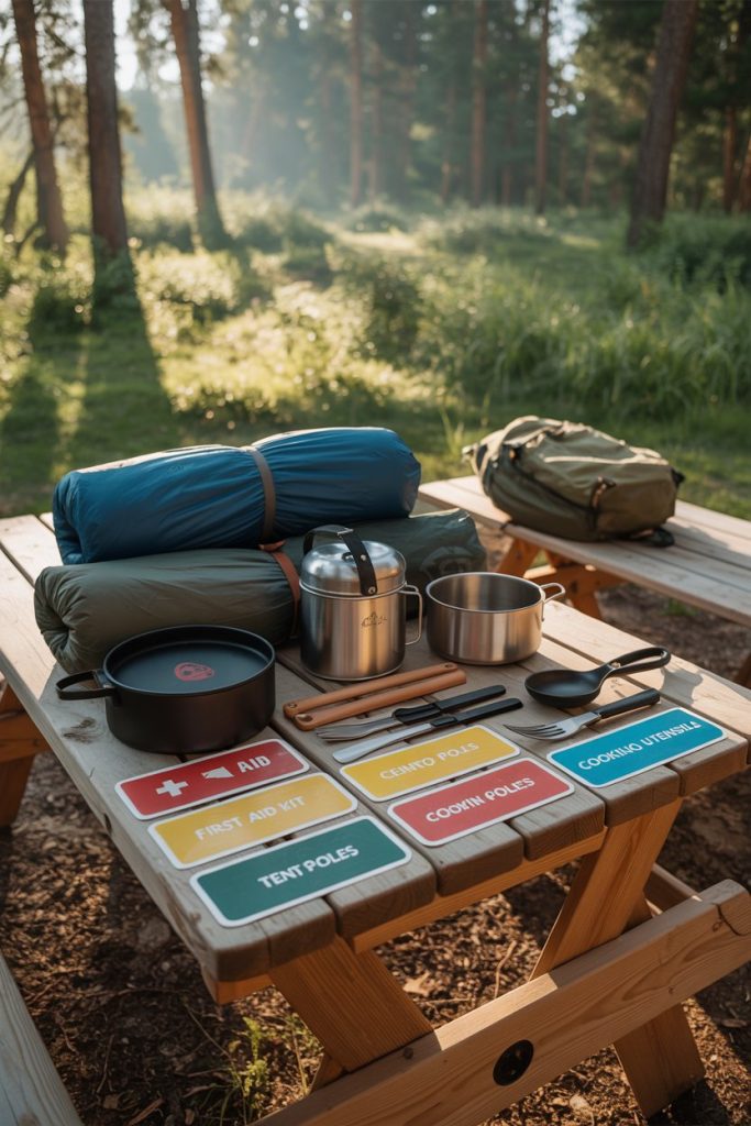 Design identification systems that work for various lighting conditions and distances. Consider including contact information for valuable items and creating matching sets for items that travel together. Organization reduces setup and breakdown time at campsites.