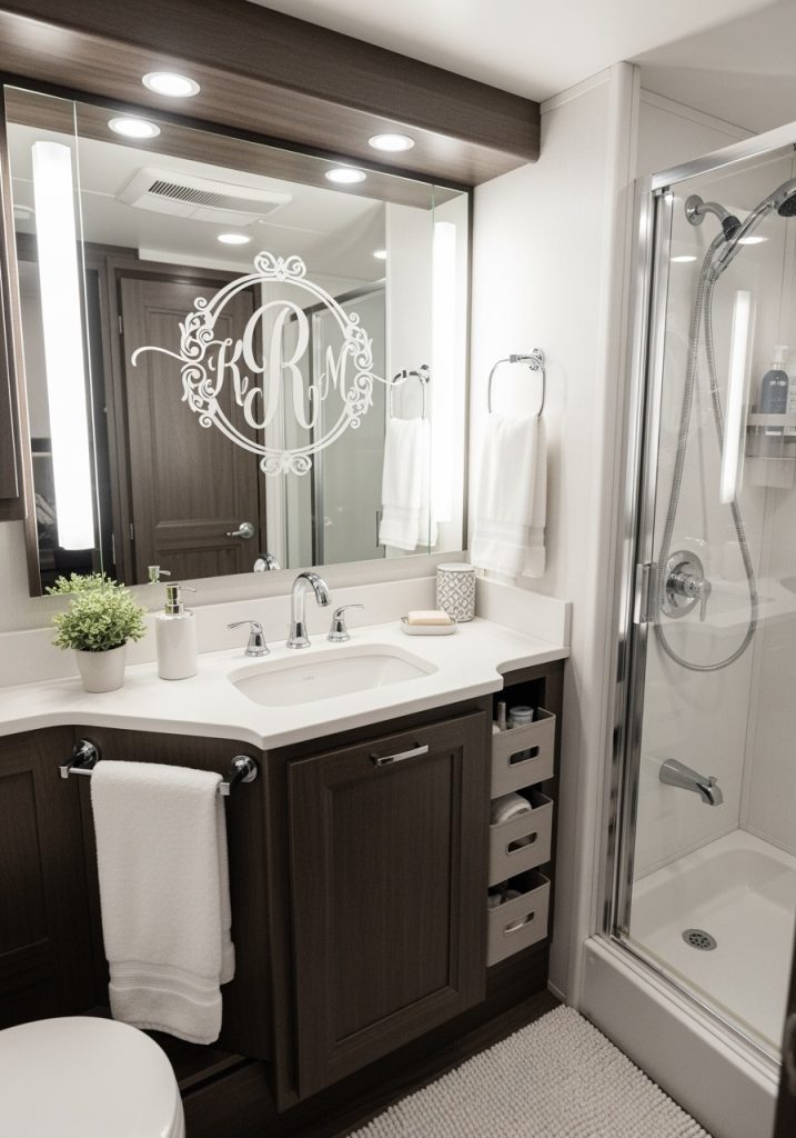 Add elegance to your RV bathroom with custom vinyl monograms, quotes, or decorative borders applied directly to mirrors. This simple upgrade can transform a basic bathroom mirror into a design statement. Choose designs that reflect your personal style – elegant script fonts for a classic look, or bold sans-serif lettering for modern appeal.