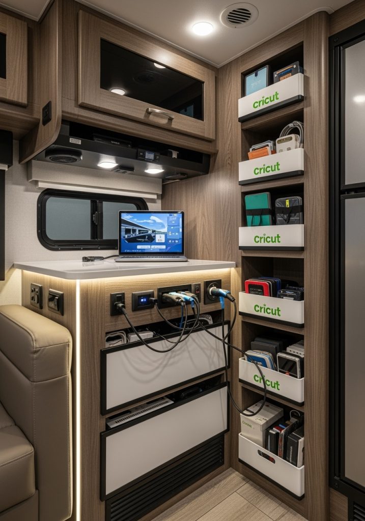 Design charging stations and technology storage that keeps devices organized while maintaining clean aesthetics. RVs require multiple electronic devices for communication, navigation, and entertainment, creating potential cord clutter and organization challenges.