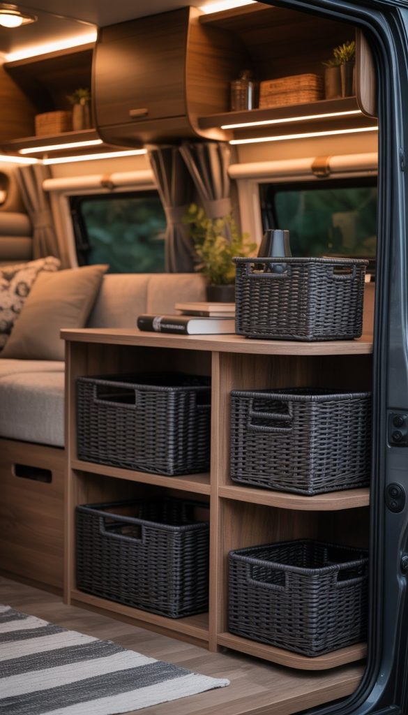 Black woven basket organizers bring both style and function to your RV. They offer a neat way to store items while adding a modern touch. Their dark tone helps keep the space looking polished and less cluttered.