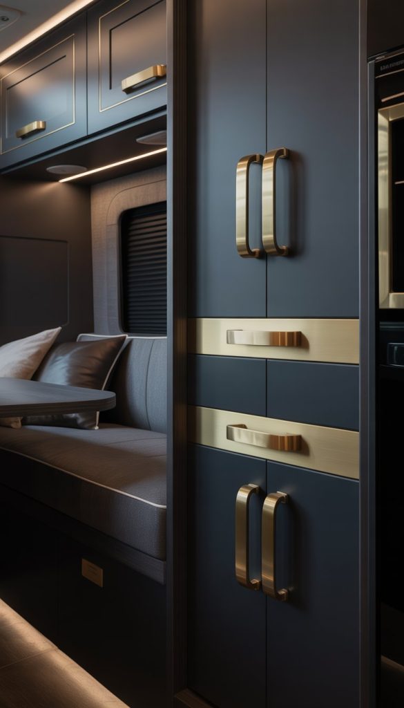 Brushed brass hardware adds a warm, elegant touch to your RV’s dark interior. It creates a nice contrast without being too bright or shiny. Using brass on handles, knobs, and light fixtures can make the space feel more polished.