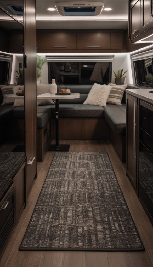 A charcoal patterned area rug can add a sleek touch to your RV’s interior. Its dark tone brings warmth without making the space feel smaller. The pattern also helps hide dirt and wear, which is great for travel.